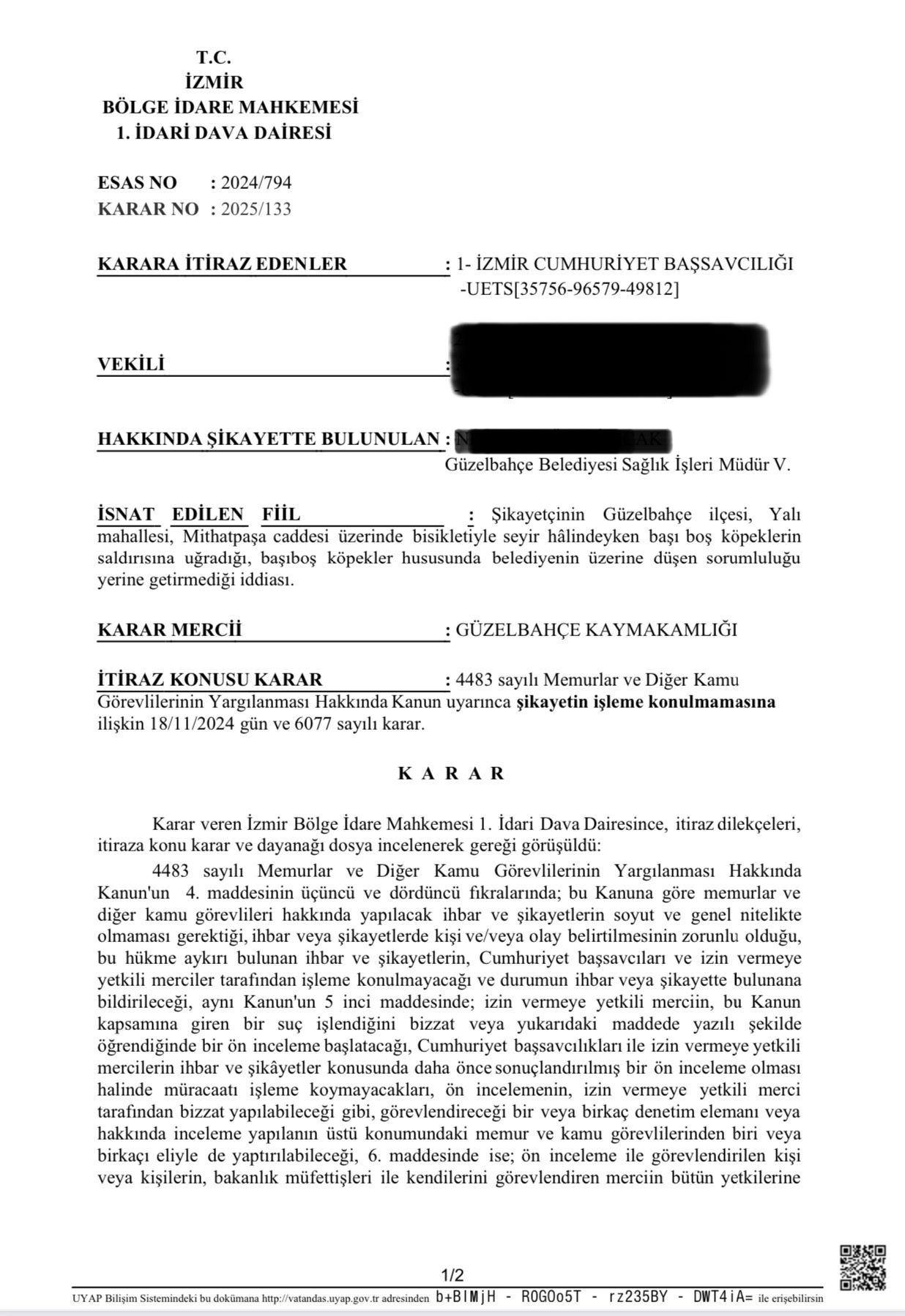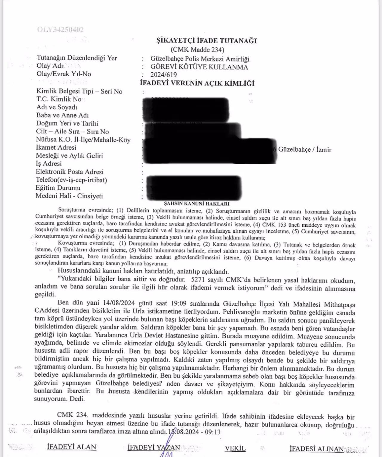 Bu olay sonrası mağdur vatandaş, Güzelbahçe Belediye Başkanlığı ve yetkilileri hakkında hata duyurusunda bulunmuştu. Şikayetinde, daha evvel tekraren başıboş köpek meselesini bildirdiğini lakin belediyenin rastgele bir tedbir almadığını belirtmişti. Suçlamalar ortasında “görevi berbata kullanma” ve “ihmal” de yer aldı.
