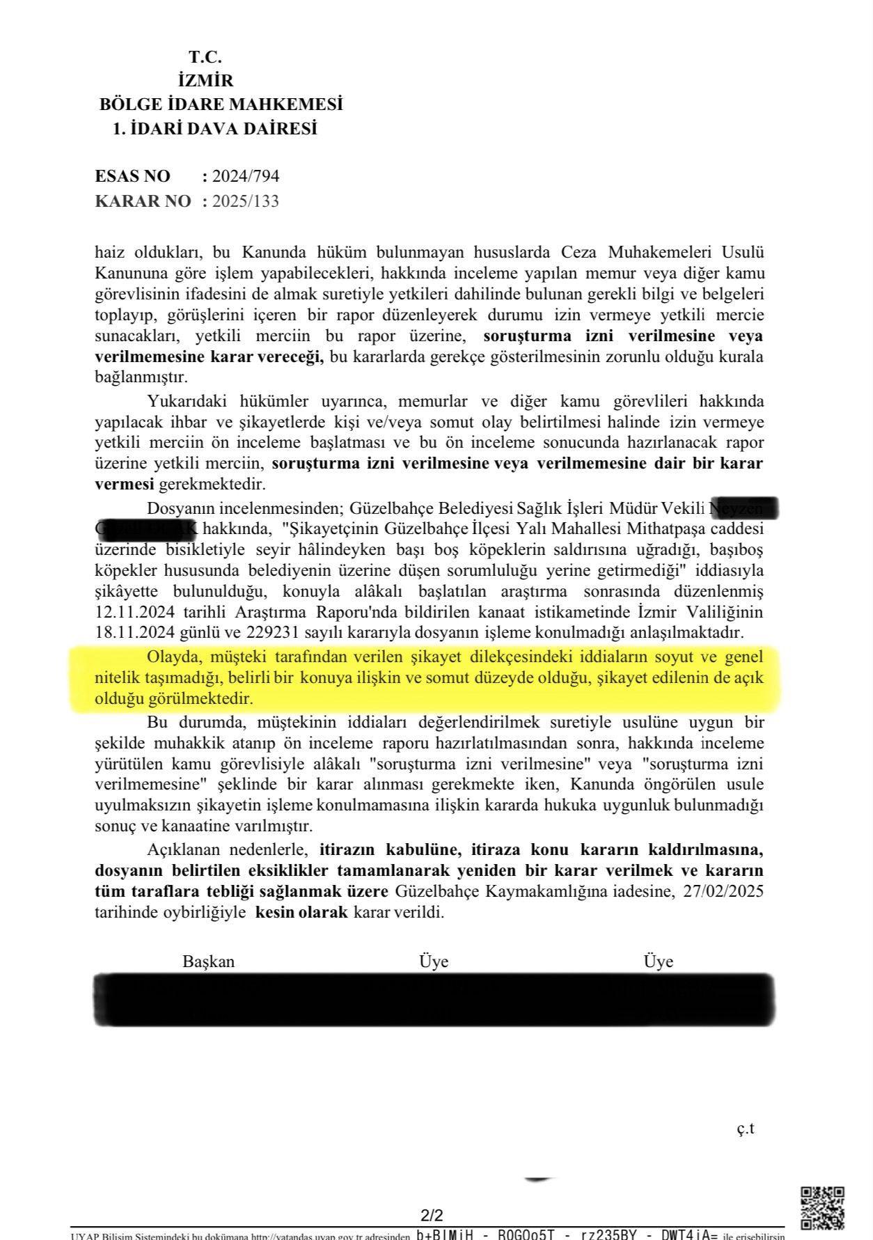 İzmir’in Güzelbahçe ilçesinde, bisiklet sürerken başıboş köpeklerin saldırısına uğrayan vatandaşın açtığı davaya yönelik Güzelbahçe Kaymakamlığı, CHP’li Belediye Başkanı Mustafa Günay ve belediye yetkililerinin yargılanmasına müsaade vermemişti. Lakin İzmir Bölge Yönetim Mahkemesi, olayın somut olduğunu belirterek kaymakamlığın “işleme koymama” kararını iptal etti.
